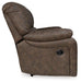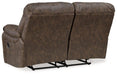 Living room lounging, with a touch of simply stunning character. This reclining loveseat seamlessly complements your contemporary cozy space. Accented by jumbo stitching, the versatile chocolate faux leather is a tried-and-true approach to everyday style. And with only a simple pull needed to extend the recliner on either side, this piece proves homey, inviting design and superb comfort go hand in hand.