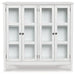 Give your home vintage charm and valuable storage with this stunning accent cabinet. Two shelves behind glass-front doors will help you display your favorite dinnerware or books in casual style. Its simple farmhouse design and beautifully distressed whitewash finish evoke the feel of a quaint cottage escape.